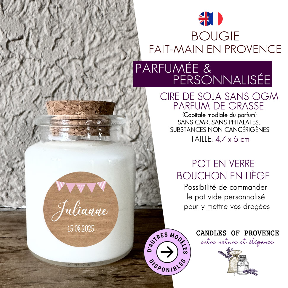 Fabriquée à la main avec une cire végétale naturelle, elle offre un souvenir unique à vos invités. Personnalisée avec le prénom et la date, cette bougie parfumée devient un petit présent chaleureux et apprécié.