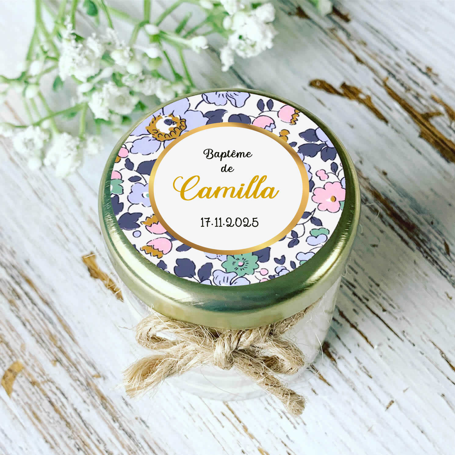 Offrez un souvenir raffiné avec cette bougie baptême Liberty bleu personnalisée. Son motif fleuri délicat et ses couleurs lumineuses en font un cadeau invité idéal pour célébrer ce moment précieux. Présentée dans un joli pot avec étiquette au prénom et à la date, cette petite bougie apporte une touche élégante à votre décoration de baptême.