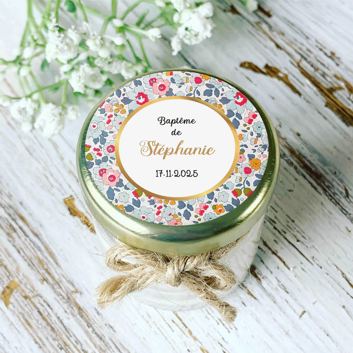 Découvrez cette jolie bougie personnalisée au motif Liberty pastel. Elle apporte une touche douce et élégante à votre décoration. Le prénom et la date du baptême sont joliment mis en valeur, ce qui en fait un souvenir unique pour vos proches.