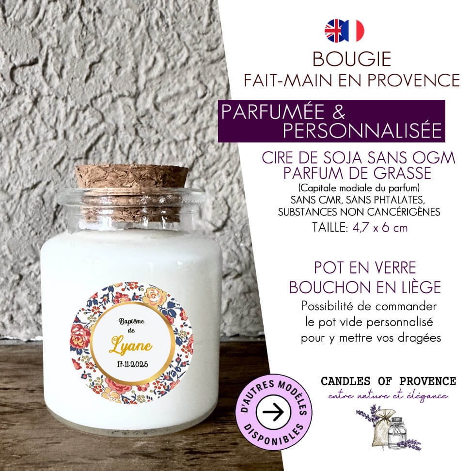 Bougie baptême personnalisée motif Liberty – Cadeau invité fleuri