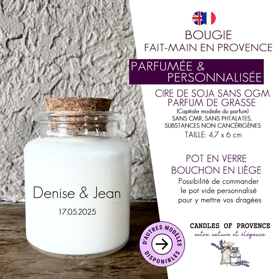 Parfaite pour vos événements : mariages, baptêmes, communions, EVJF ou baby showers. Chaque bougie parfumée personnalisée est un souvenir unique à offrir à vos invités.