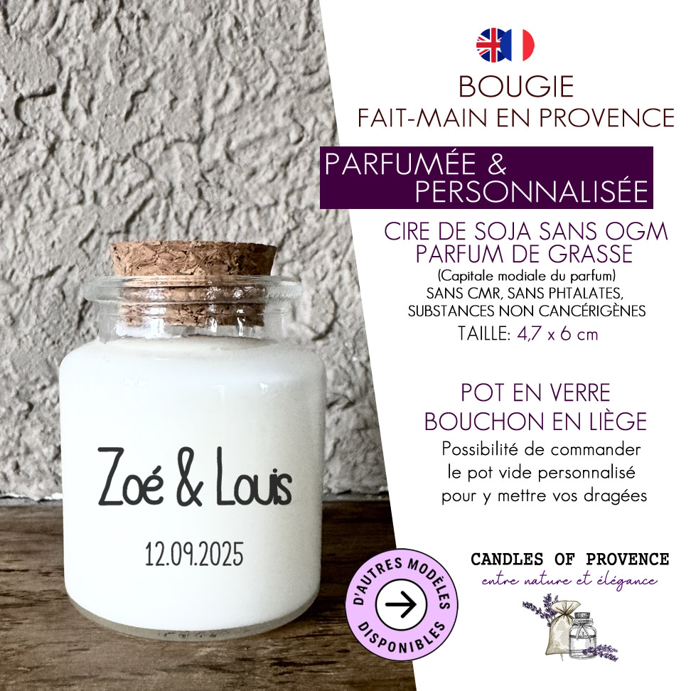 Offrez à vos invités un souvenir élégant et authentique. Chaque bougie est fabriquée à la main en France à partir de cire de soja naturelle et végan.