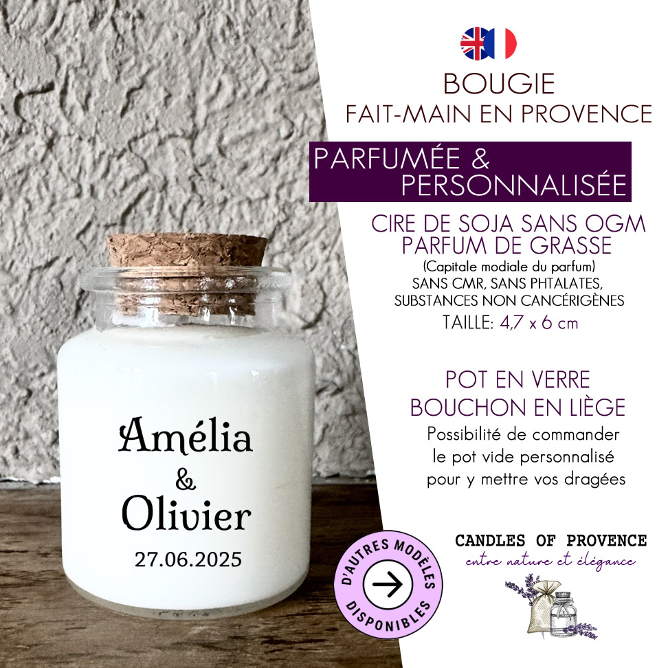 Parfaite pour vos événements: mariages, baptêmes, communions, EVJF ou baby showers. Chaque bougie parfumée personnalisée est un souvenir unique à offrir à vos invités.