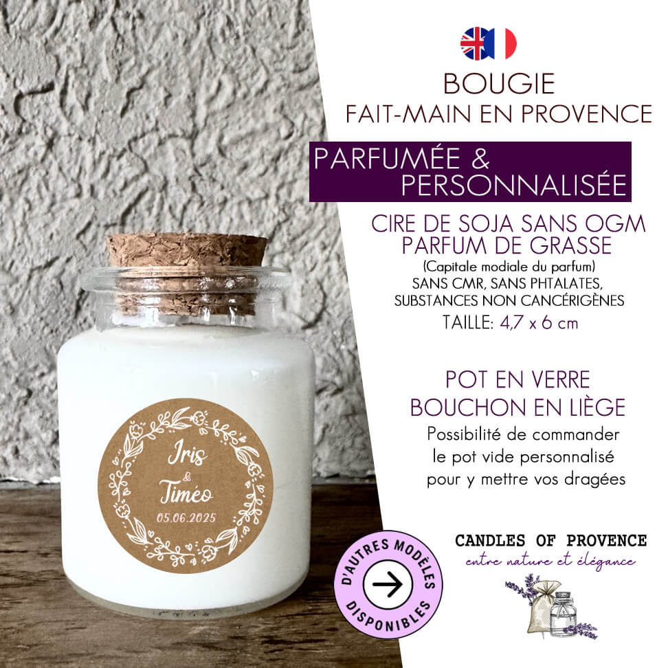 Offrez une bougie personnalisée mariage délicate et naturelle pour célébrer votre événement. Grâce à son étiquette kraft ornée d’une couronne florale blanche, cette faveur de mariage apporte une touche bohème et chaleureuse à vos tables. De plus, son style artisanal convient parfaitement aux mariages champêtres, rustiques ou élégants.
