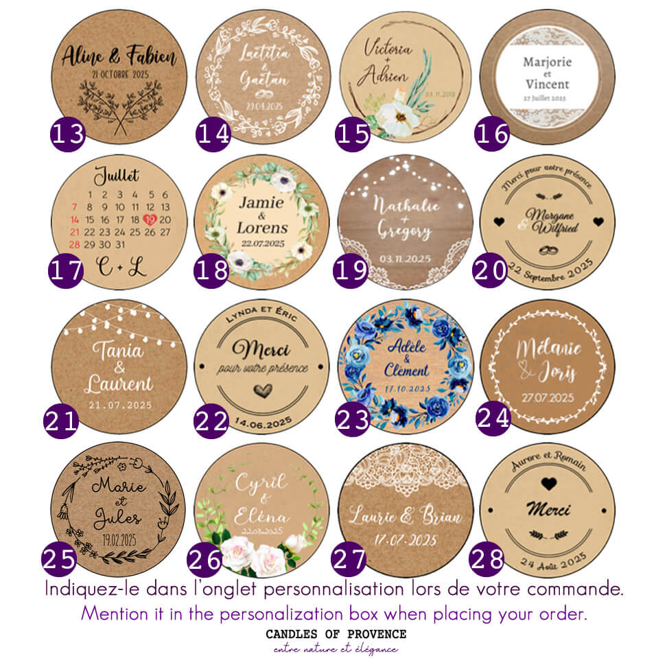 Parfaite pour vos événements: mariages, baptêmes, communions, EVJF ou baby showers. Chaque bougie parfumée personnalisée est un souvenir unique à offrir à vos invités.