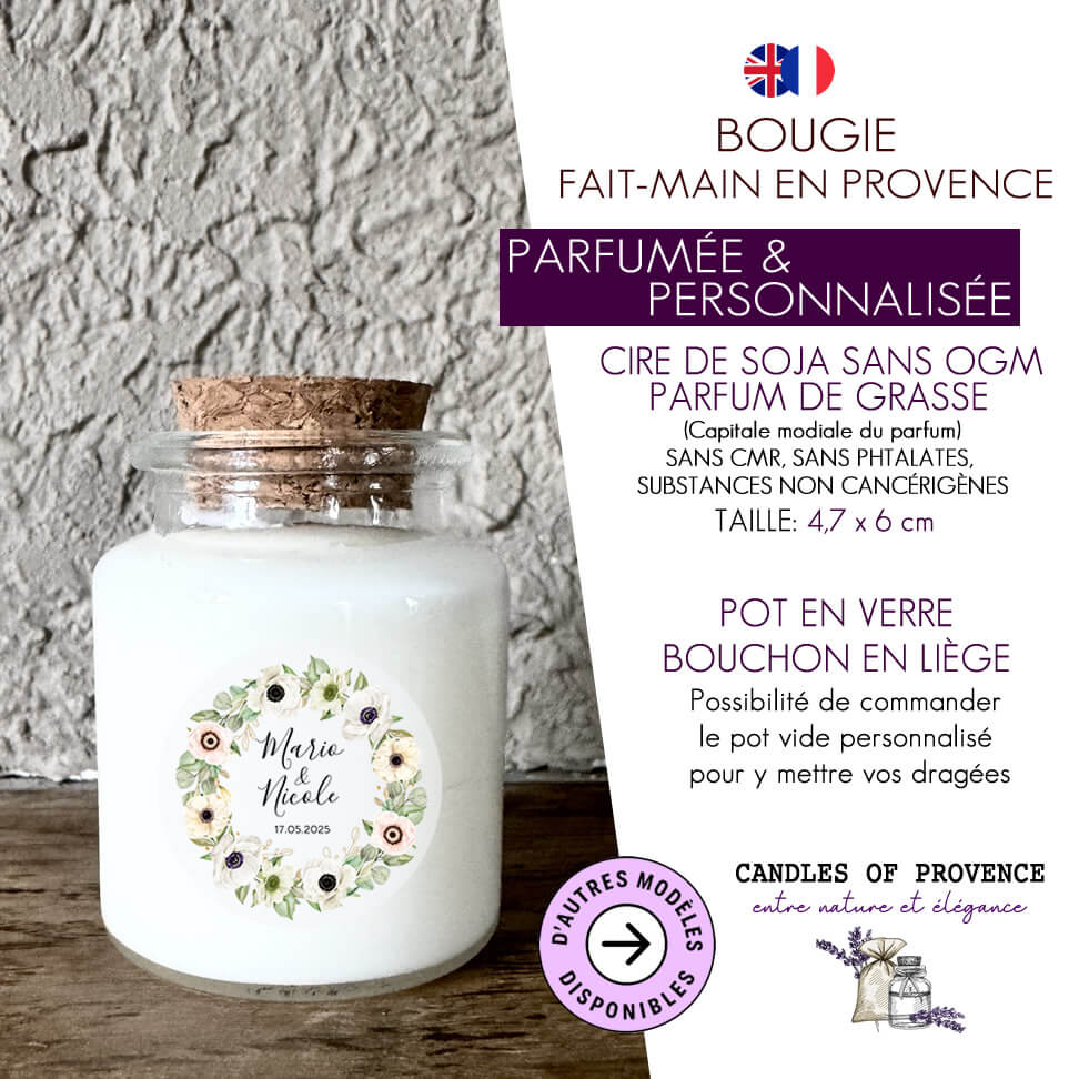 Coulée à la main en cire végétale, cette bougie parfumée devient un souvenir unique grâce à la personnalisation avec vos prénoms et la date de votre mariage. Une idée cadeau chaleureuse et délicate, idéale pour offrir à vos proches et sublimer votre décoration de table.