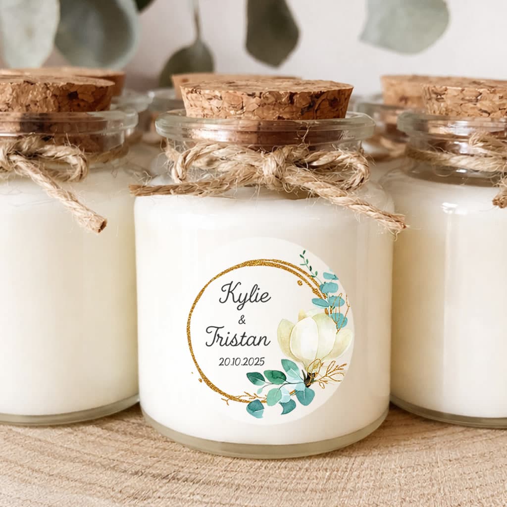 Bougie parfumée personnalisée fleur blanche et eucalyptus – Mariage Chic Champêtre
