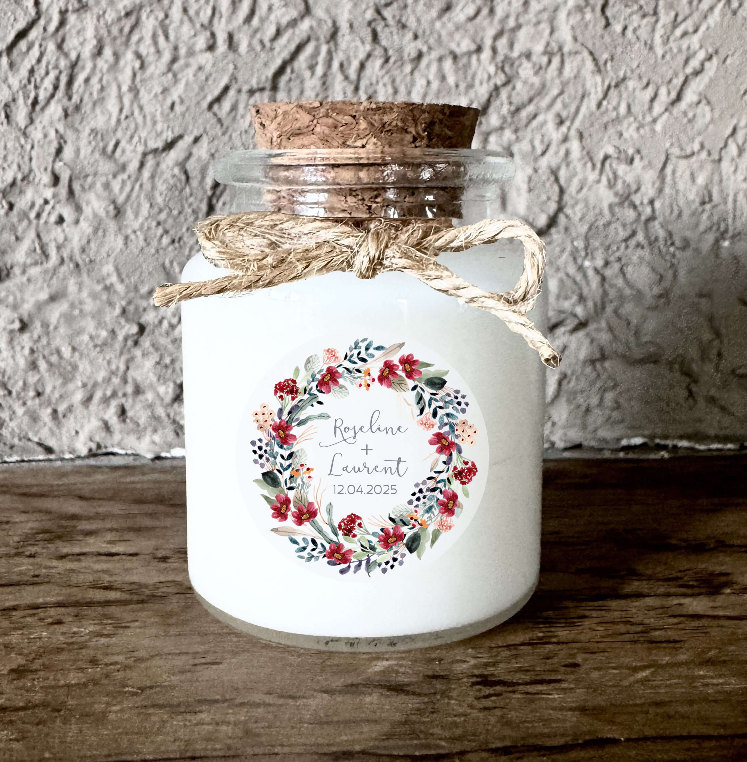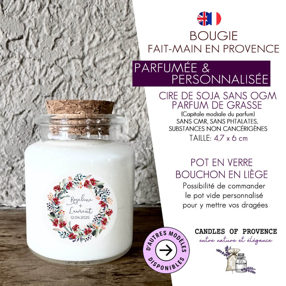 Cette bougie mariage personnalisée est décorée d’une couronne florale rouge et de feuillage eucalyptus, un motif lumineux et élégant qui apporte une touche romantique à votre événement. Personnalisée avec les prénoms et la date, elle devient un cadeau invité précieux et chaleureux.