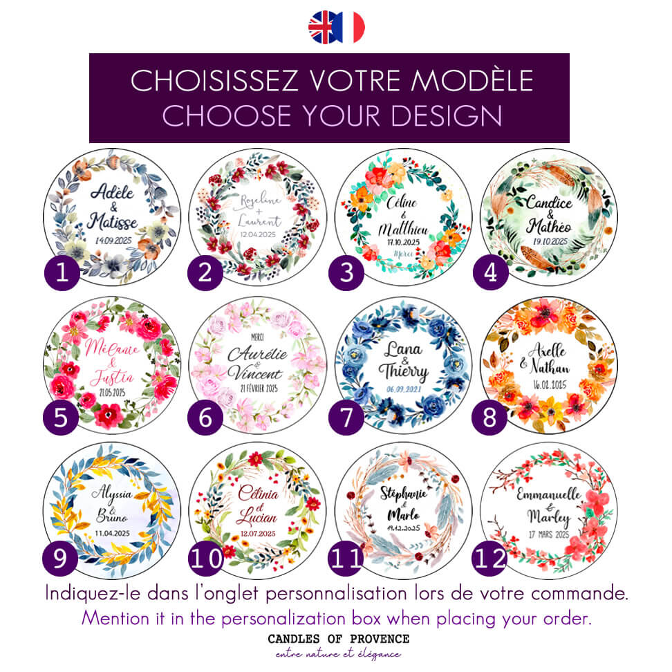 Chaque bougie est coulée à la main avec une cire végétale naturelle. Elle offre un souvenir parfumé que vos invités garderont longtemps. Ce modèle floral et feuillage convient parfaitement à un mariage printanier, bohème ou champêtre.