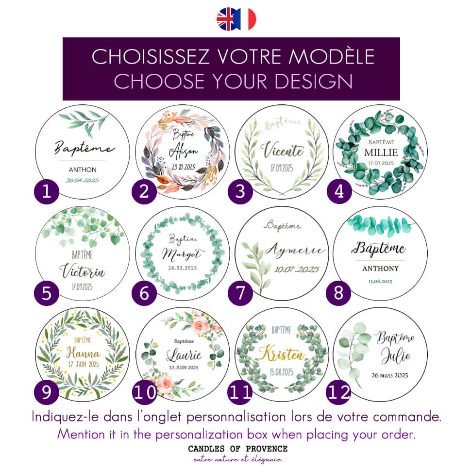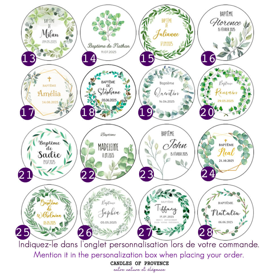 Cette mini bougie personnalisée au design eucalyptus & feuillage est une jolie attention à offrir lors d’un baptême. Son style naturel, doux et intemporel s’accorde à toutes les décorations : bohème, champêtre, végétale ou minimaliste. Grâce à sa personnalisation (prénom + date), elle devient un véritable souvenir que vos invités garderont longtemps.