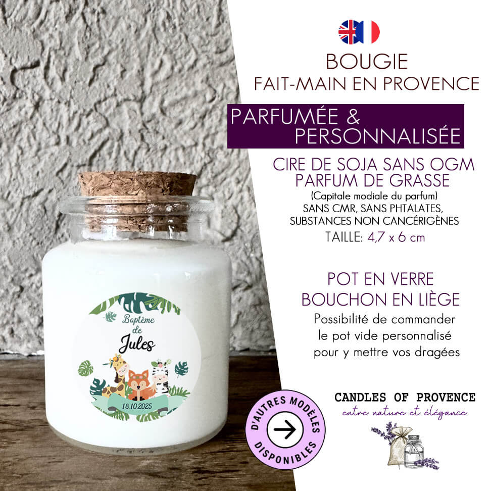 Fabriquée à la main en France avec une cire végétale de qualité, cette bougie parfumée est un véritable souvenir personnalisé. Elle décore joliment votre table de baptême et permet de remercier vos invités avec une attention unique et mémorable.