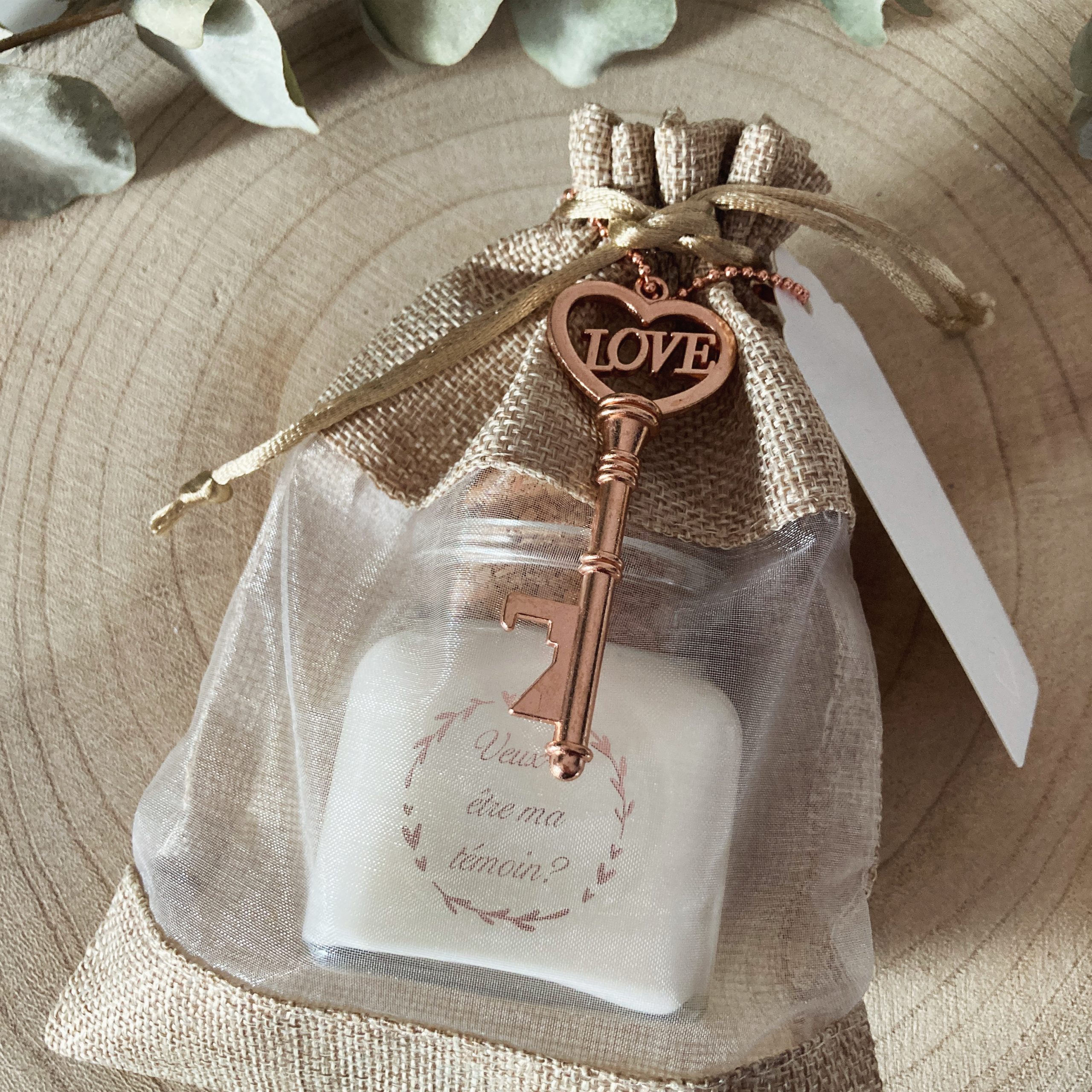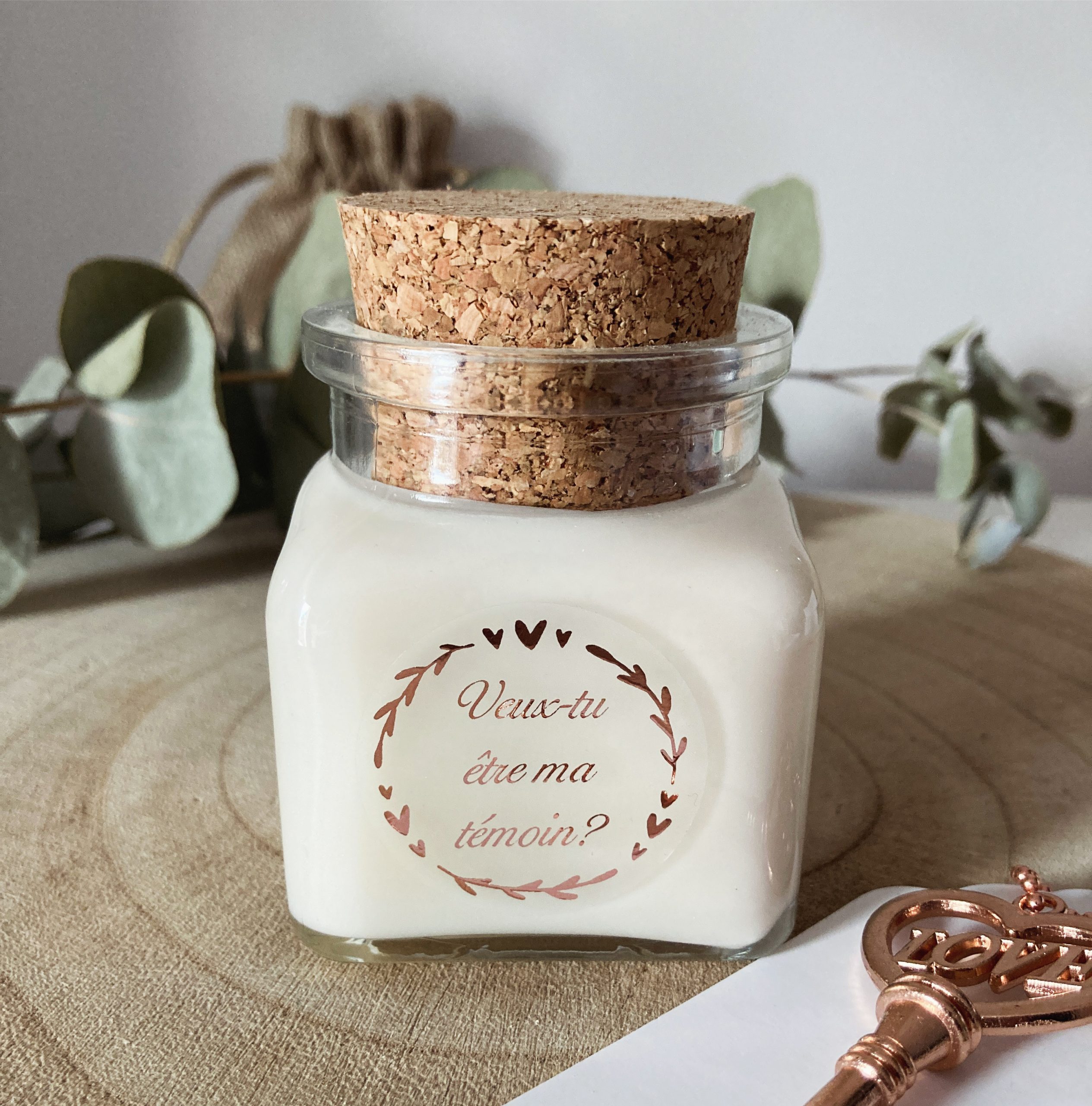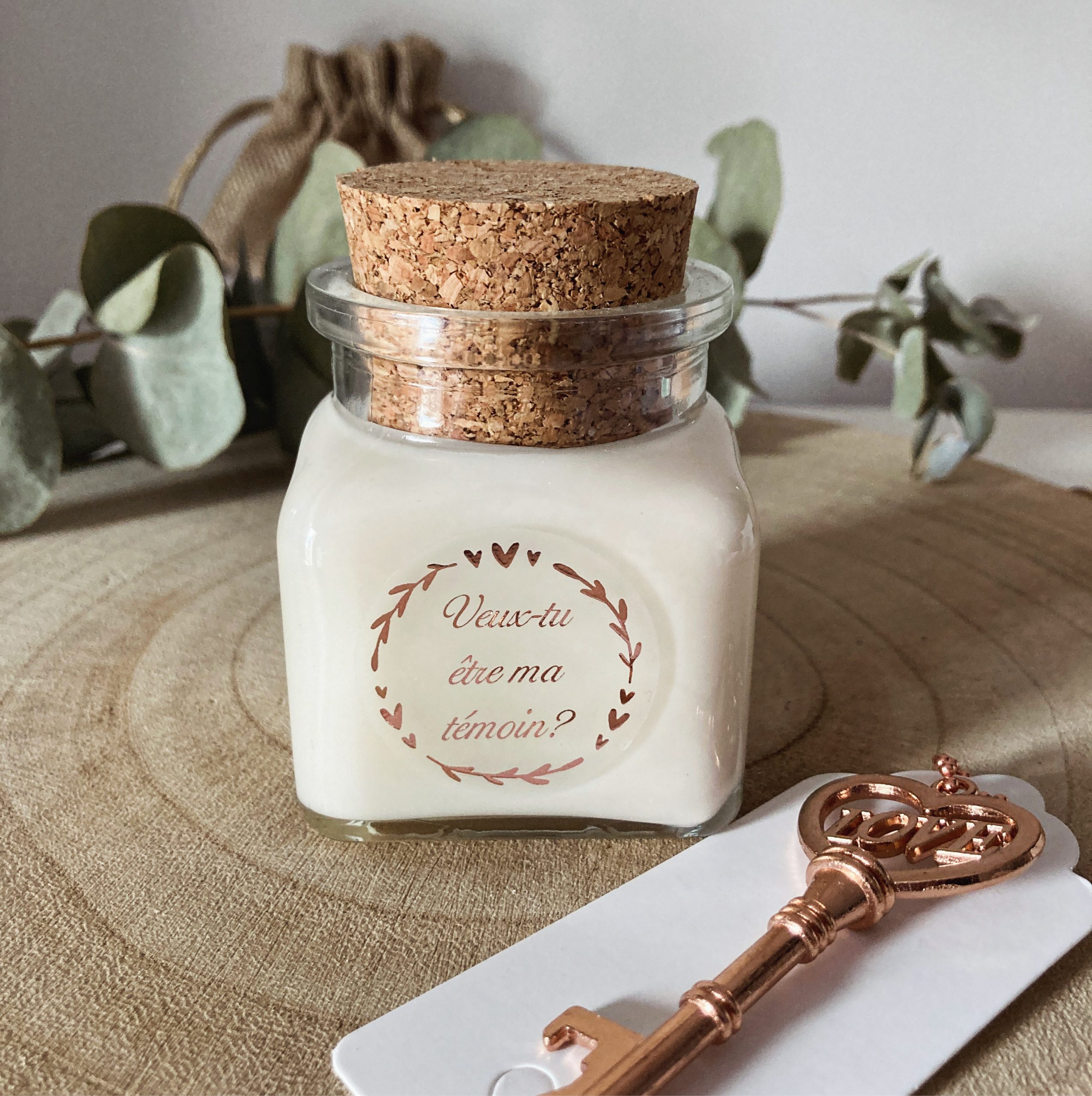 Bougie personnalisée demande témoin mariage écriture rose gold cadeau original de 120ml avec sou sans son pochon et décapsuleur original en forme de clé. Message: “Veux-tu être ma témoin?”.