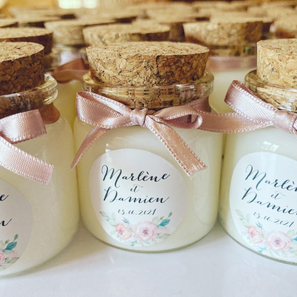 Pour le mariage de Marlène & Damien, j’ai réalisé une série de bougies personnalisées pensées spécialement comme cadeaux invités mariage. Une attention élégante, utile et pleine de sens, idéale pour remercier ses proches avec un souvenir qui dure.