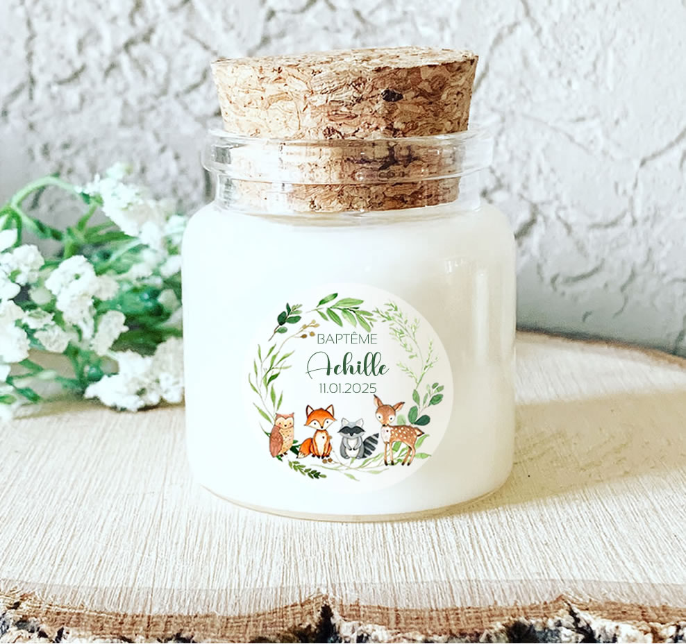 Cette bougie personnalisée pour baptême est décorée d’animaux de la forêt. Elle présente un renard, un hibou, un raton laveur et un faon. Ce style illustré plaît beaucoup pour les baptêmes nature.
