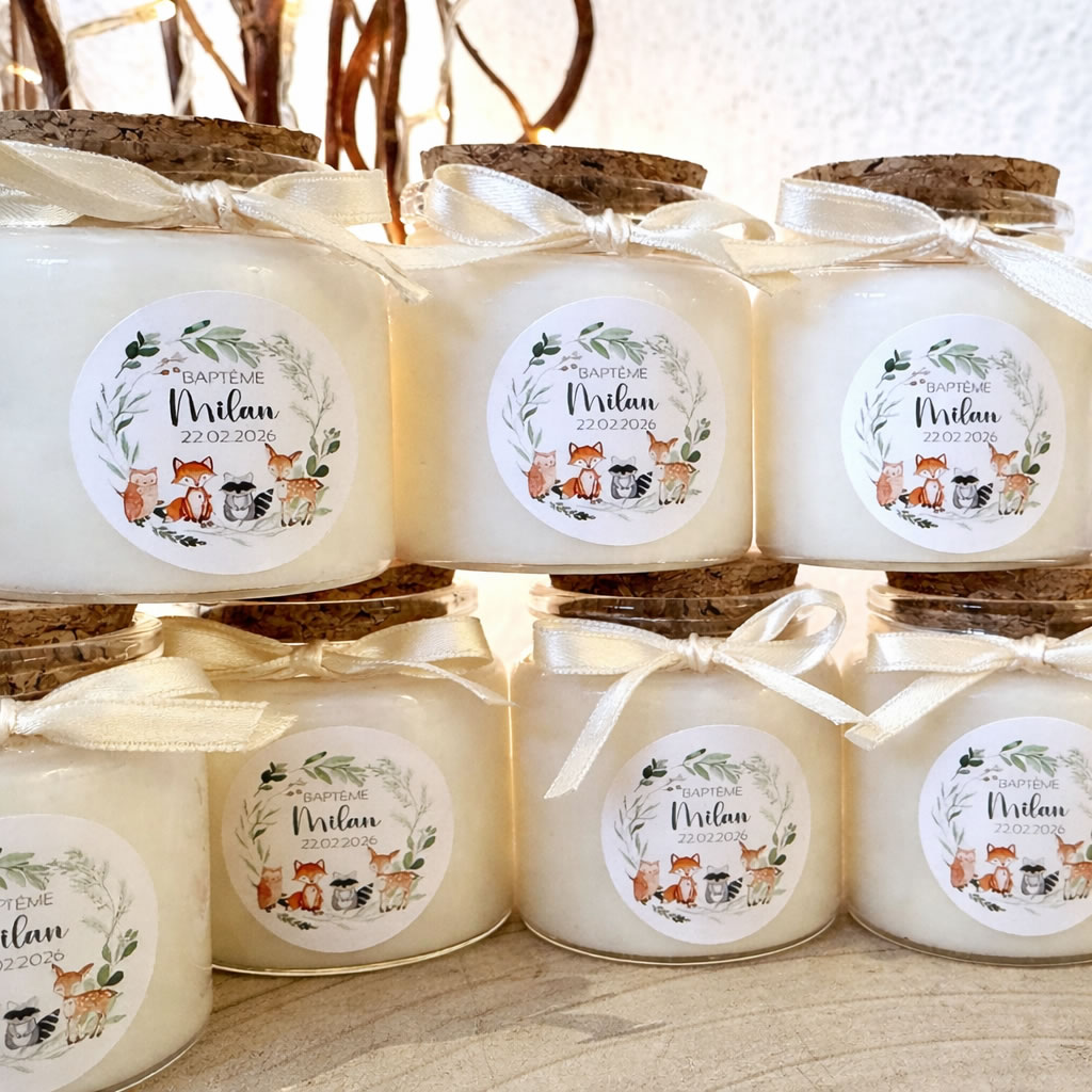 C’est un cadeau invité original, facile à offrir et apprécié de tous. Chaque bougie est unique, car elle est personnalisée avec le prénom et la date du baptême. Cette bougie parfumée fait-main est parfaite pour vos invités de mariages, baptêmes, communions, anniversaires, baby showers, naissance, fêtes, repas, cadeaux, évènements… Vos invités l’adoreront !