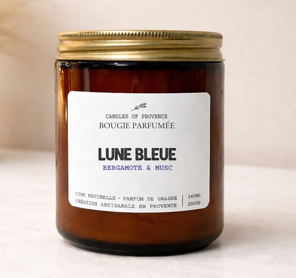 La bougie parfumée Lune Bleue capture la douceur mystérieuse d’un ciel nocturne baigné de lumière.
