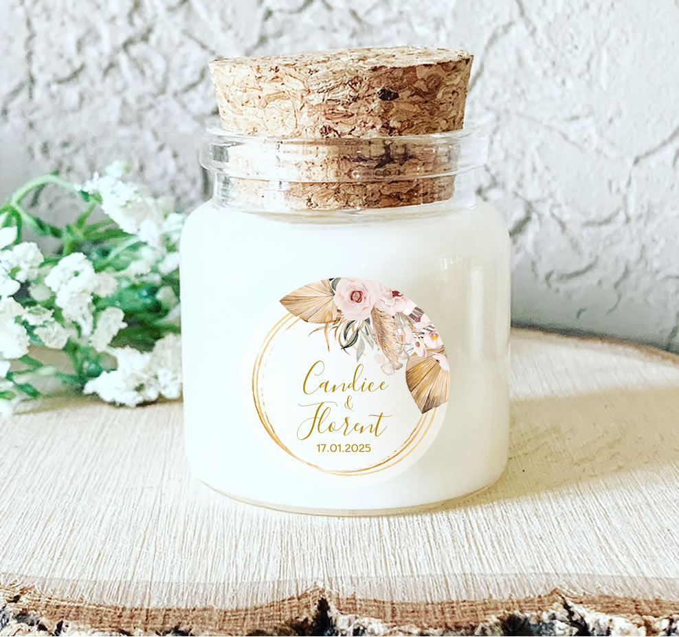 Cette bougie personnalisée mariage boho chic est un cadeau invité élégant et chaleureux. Elle présente une couronne dorée aquarelle, accompagnée de fleurs séchées et de roses pastel. Ce style doux et raffiné crée une ambiance romantique, naturelle et moderne.