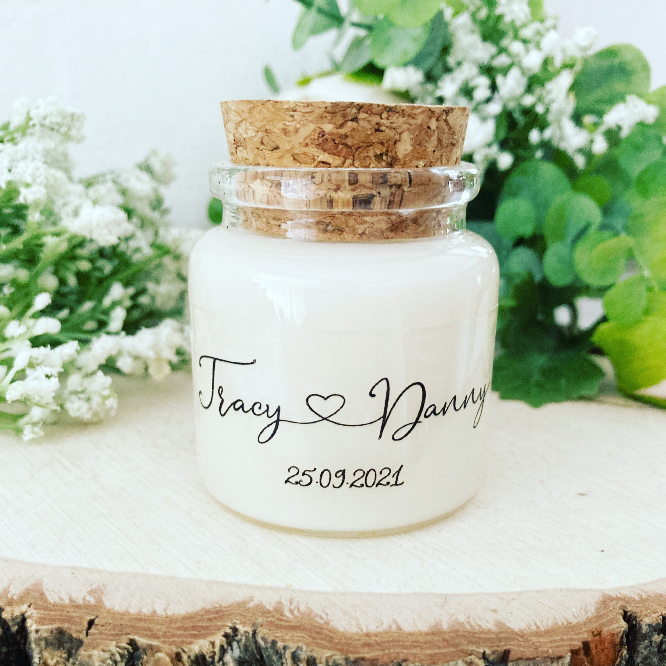 Bougies personnalisées mariage Cadeau original Modèle Tracy. Dis “Je le veux” avec un souvenir durable ! Offre à tes invités de mariage une bougie parfumée unique et personnalisée – un souvenir de ton jour spécial. Personnalise l’étiquette ou choisis l’un de nos charmants modèles. Une bougie élégante dans un verre avec un bouchon liège, fabriquée dans un style champêtre classique. Chéris ton beau jour ! Grâce à ce magnifique cadeau original, vos tables seront sublimes et vos invités de mariage se sentiront très spéciaux.