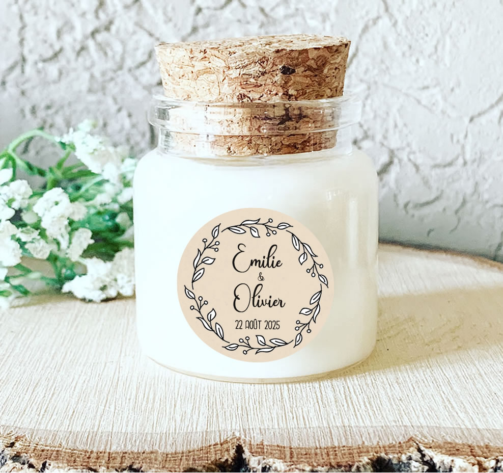 Cette bougie personnalisée mariage au design kraft beige et feuillage noir est un cadeau invité élégant et intemporel. Son style naturel et minimaliste s’harmonise facilement avec une décoration champêtre, bohème ou rustique. Chaque étiquette est personnalisée avec les prénoms et la date pour créer une faveur de mariage unique.