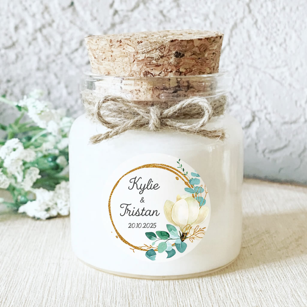 Offrez à vos invités une bougie parfumée personnalisée, élégante et raffinée. Ce modèle mariage allie la douceur d’une fleur blanche à la fraîcheur de l’eucalyptus, rehaussé d’un délicat cercle doré. Fabriquée à la main en France avec une cire de soja naturelle et vegan, cette bougie artisanale est le cadeau parfait pour remercier vos invités. Idéale pour un mariage chic, romantique ou botanique, elle apportera une touche lumineuse et poétique à vos tables.