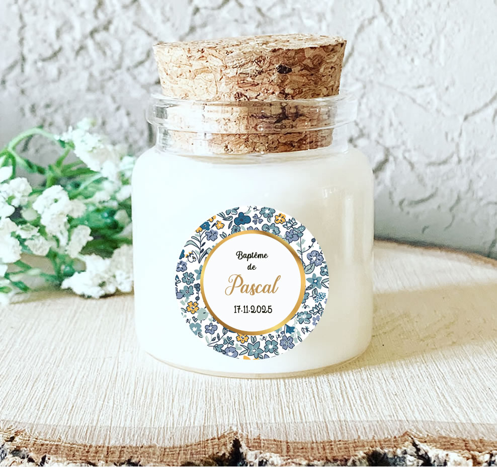 Cette bougie baptême personnalisée au motif Liberty bleu est un cadeau invité délicat et élégant pour célébrer le baptême de votre garçon. Son design fleuri dans des tons bleus et moutarde apporte une touche douce et raffinée à votre décoration.