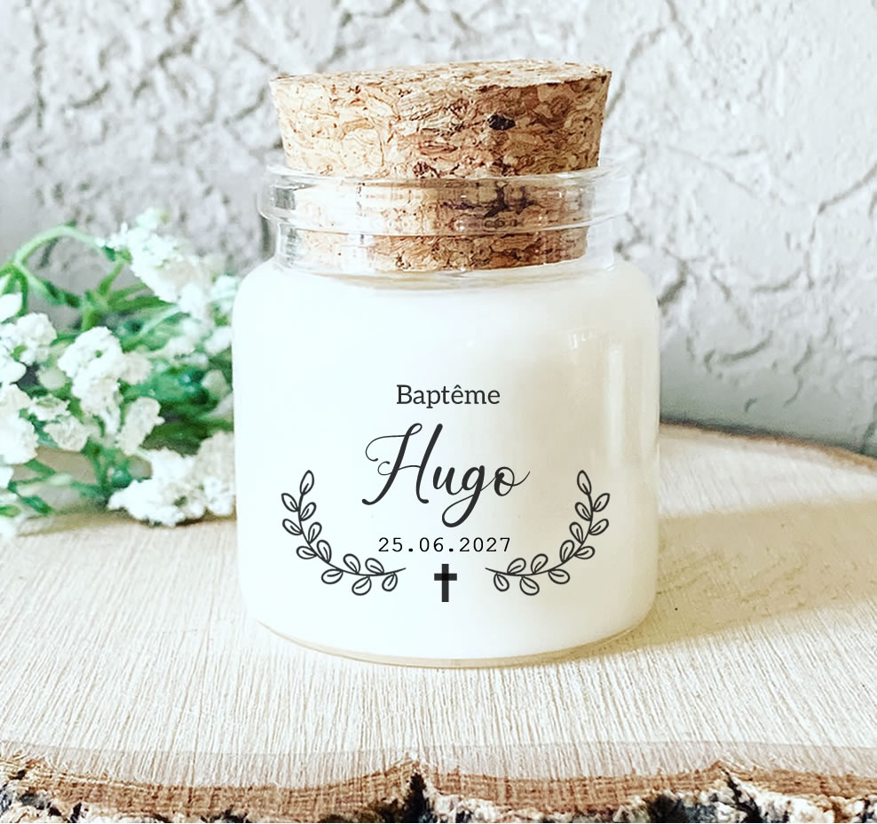 Chaque bougie parfumée personnalisée est fait-main en Provence avec soin et précision. De plus, elle est élaborée à partir de cire de qualité et de parfums délicats. Présentée dans un pot en verre avec bouchon en liège et lien en ficelle naturelle, cette mini bougie constitue un cadeau invités de baptême à la fois décoratif et significatif.