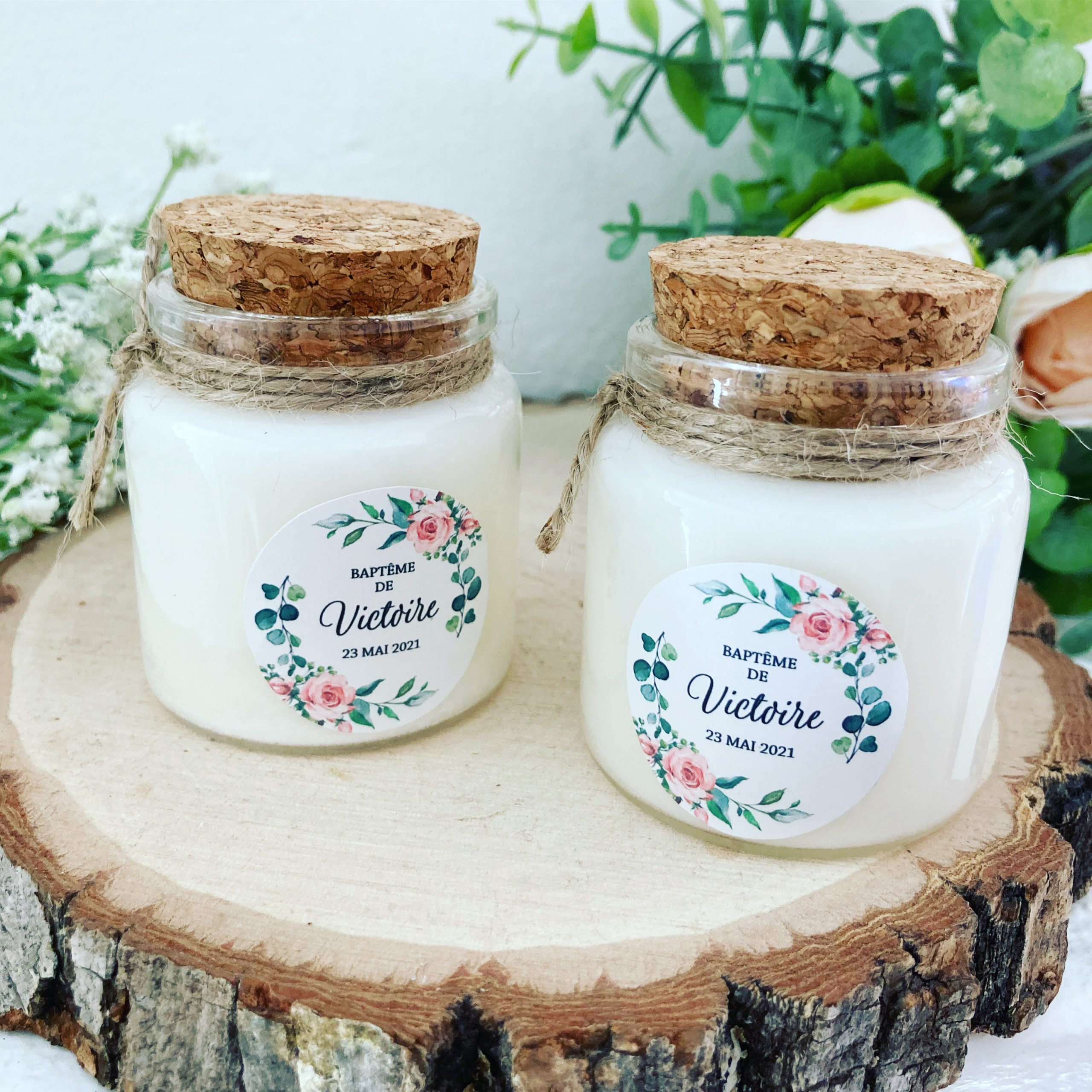 Mini Bougie personnalisée baptême eucalyptus et fleurs – Cadeaux invités