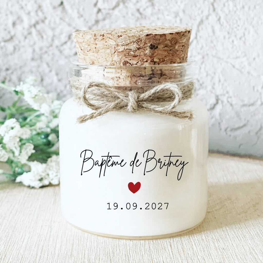 Chaque bougie parfumée personnalisée est fait-main en Provence avec soin. De plus, elle est réalisée à partir de cire de qualité et de parfums délicats. Présentée dans un pot en verre avec bouchon en liège et lien en ficelle naturelle, cette mini bougie constitue un cadeau invités de baptême à la fois décoratif et utile. Elle convient également pour une communion ou un anniversaire.