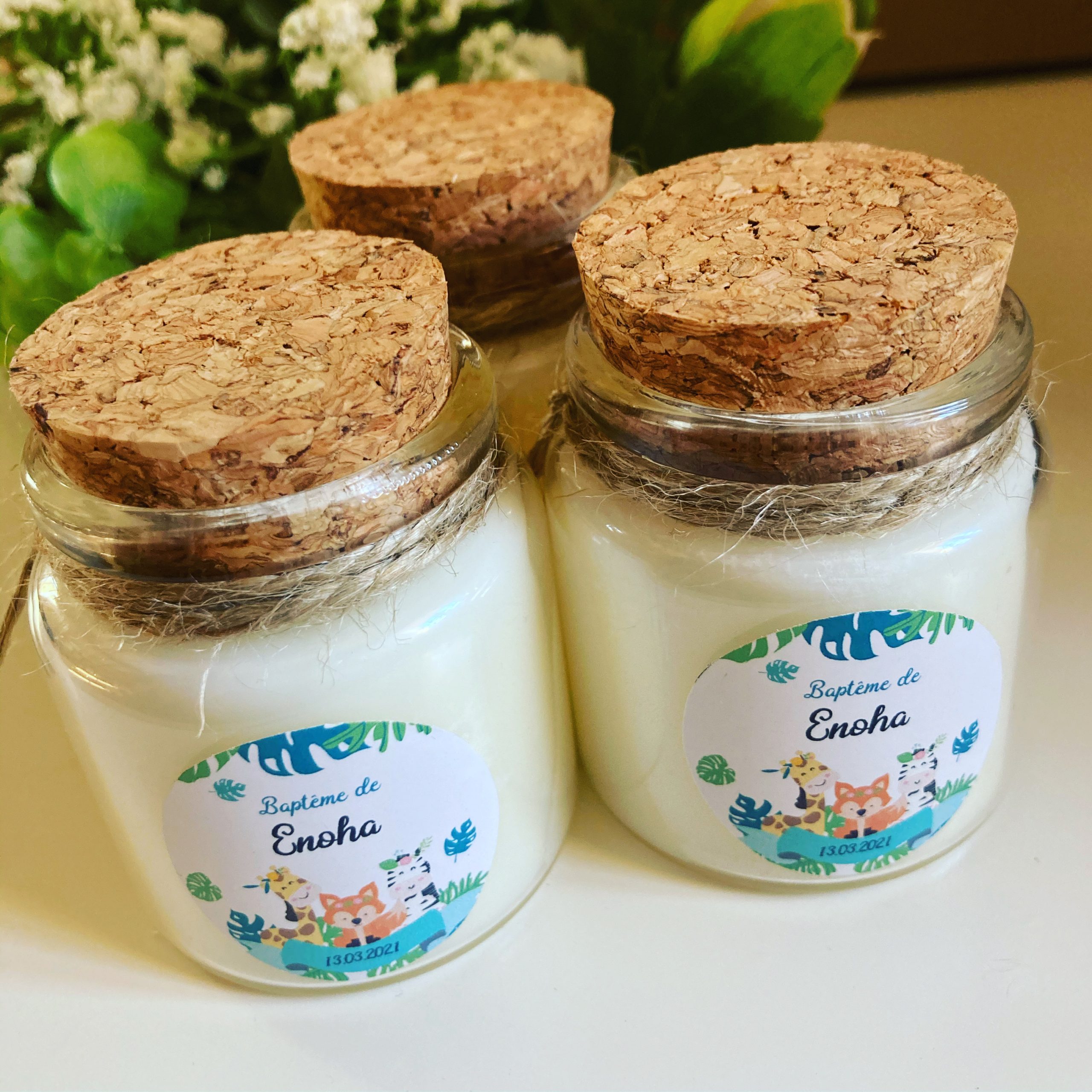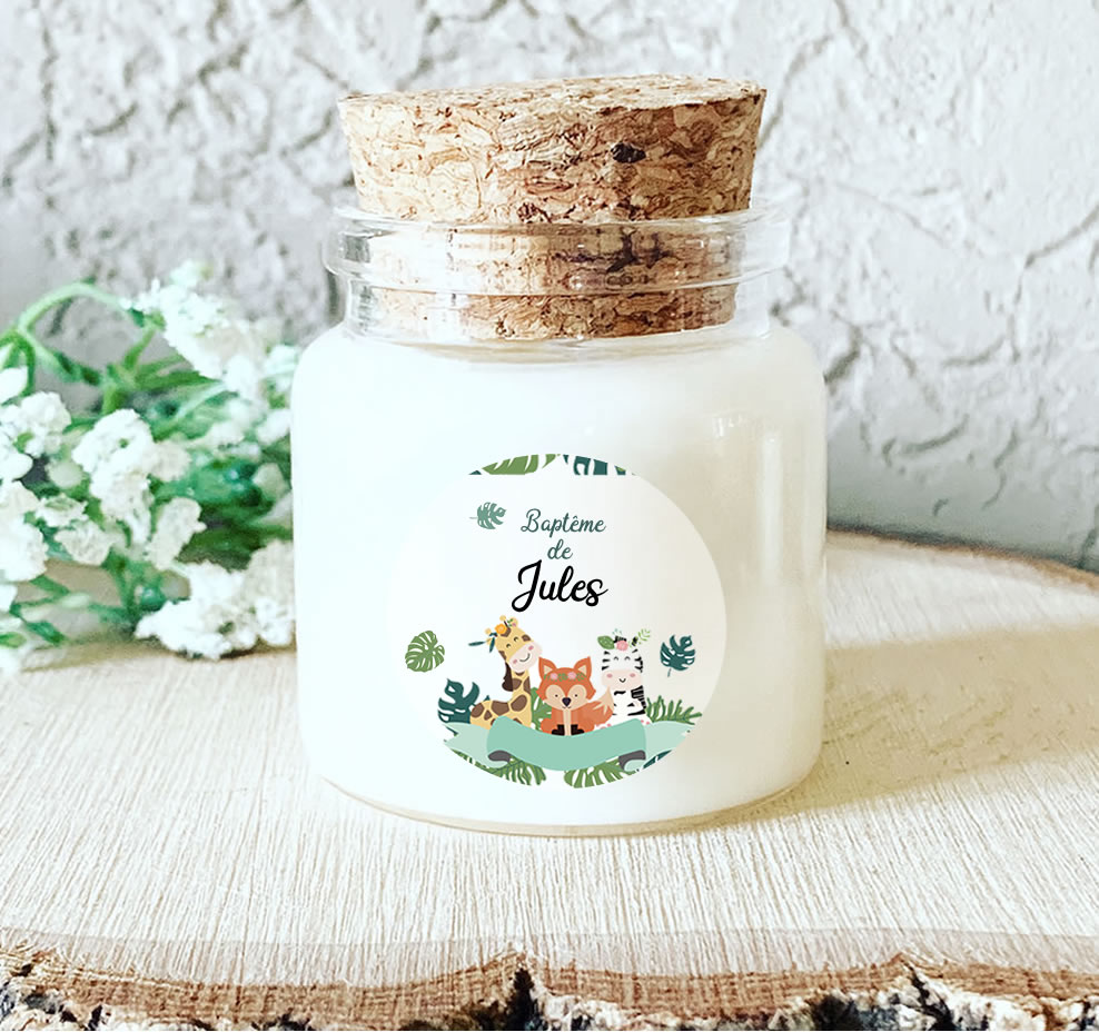 Cette bougie baptême personnalisée au thème safari est un cadeau invité adorable et tendance. Elle présente une girafe, un renard et un zèbre entourés de feuilles tropicales, pour une ambiance jungle douce et joyeuse. Ce modèle convient parfaitement à un baptême garçon ou fille, avec un style nature et ludique.