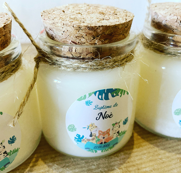 Fabriquée à la main en France avec une cire végétale de qualité, cette bougie parfumée est un véritable souvenir personnalisé. Elle décore joliment votre table de baptême et permet de remercier vos invités avec une attention unique et mémorable.