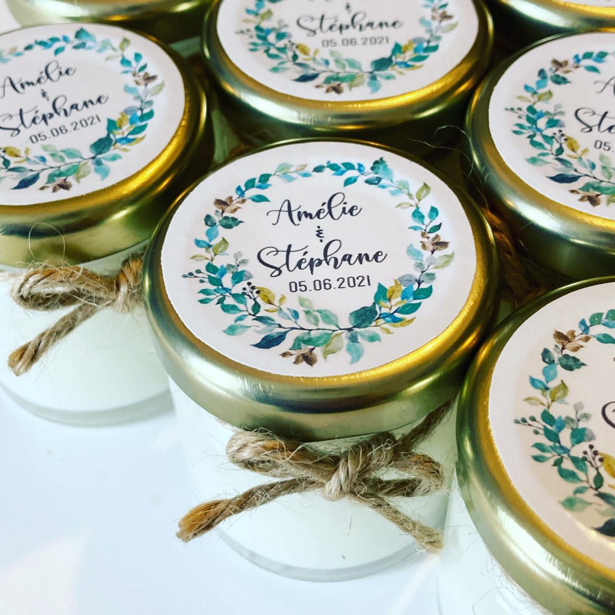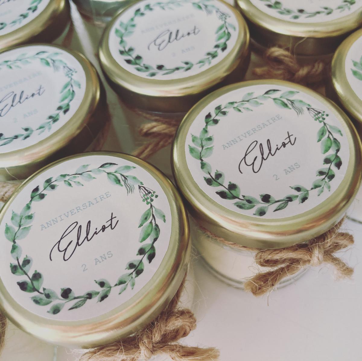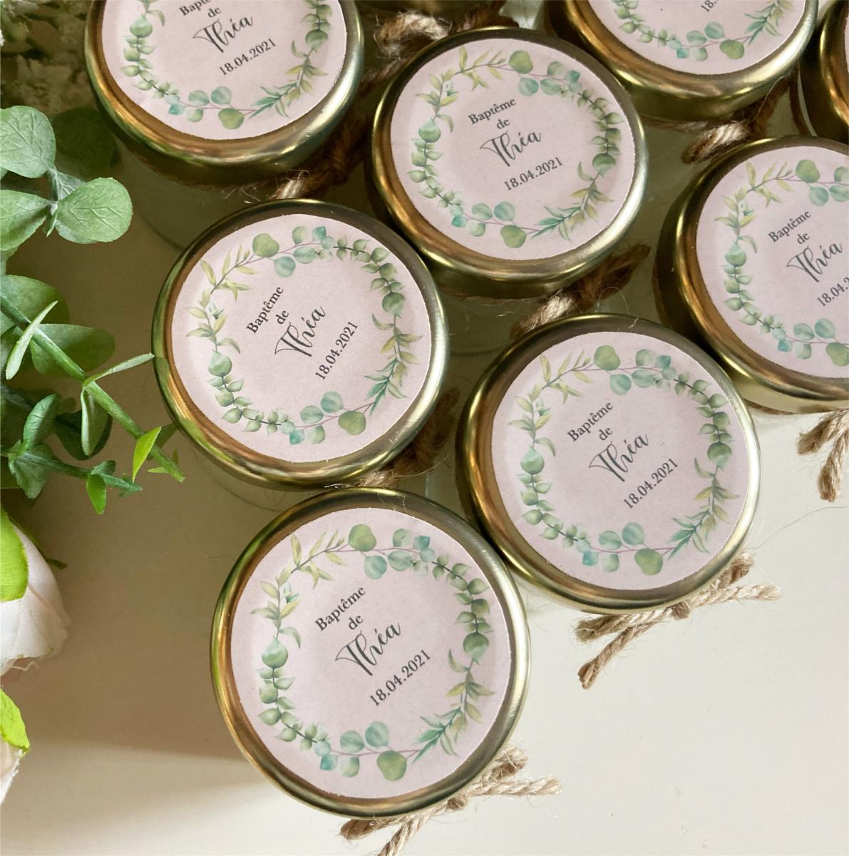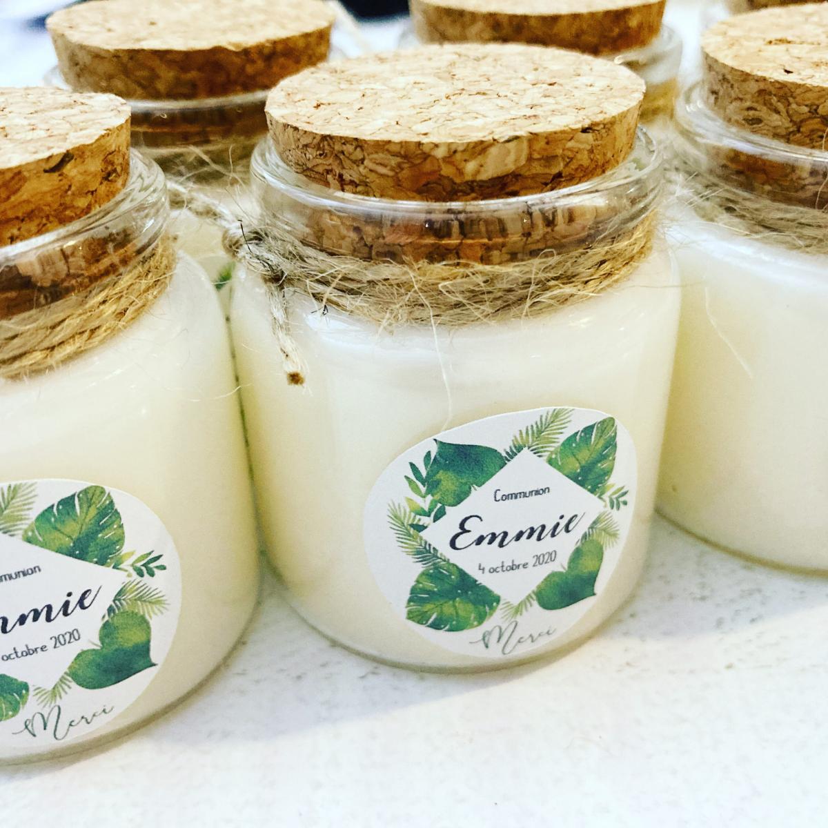 Quelques-unes de nos réalisations: bougies et pots de miel personnalisés.