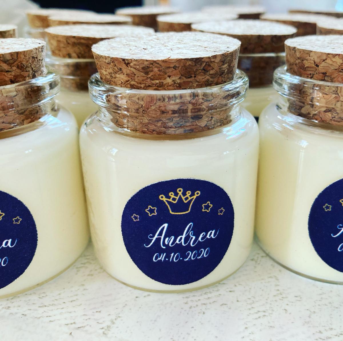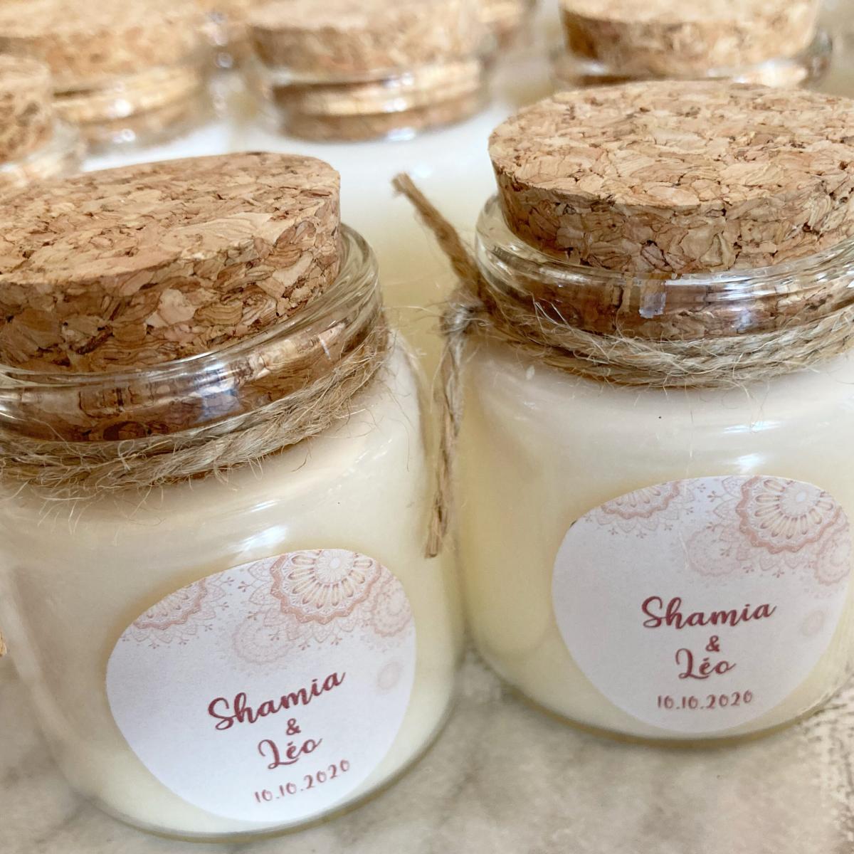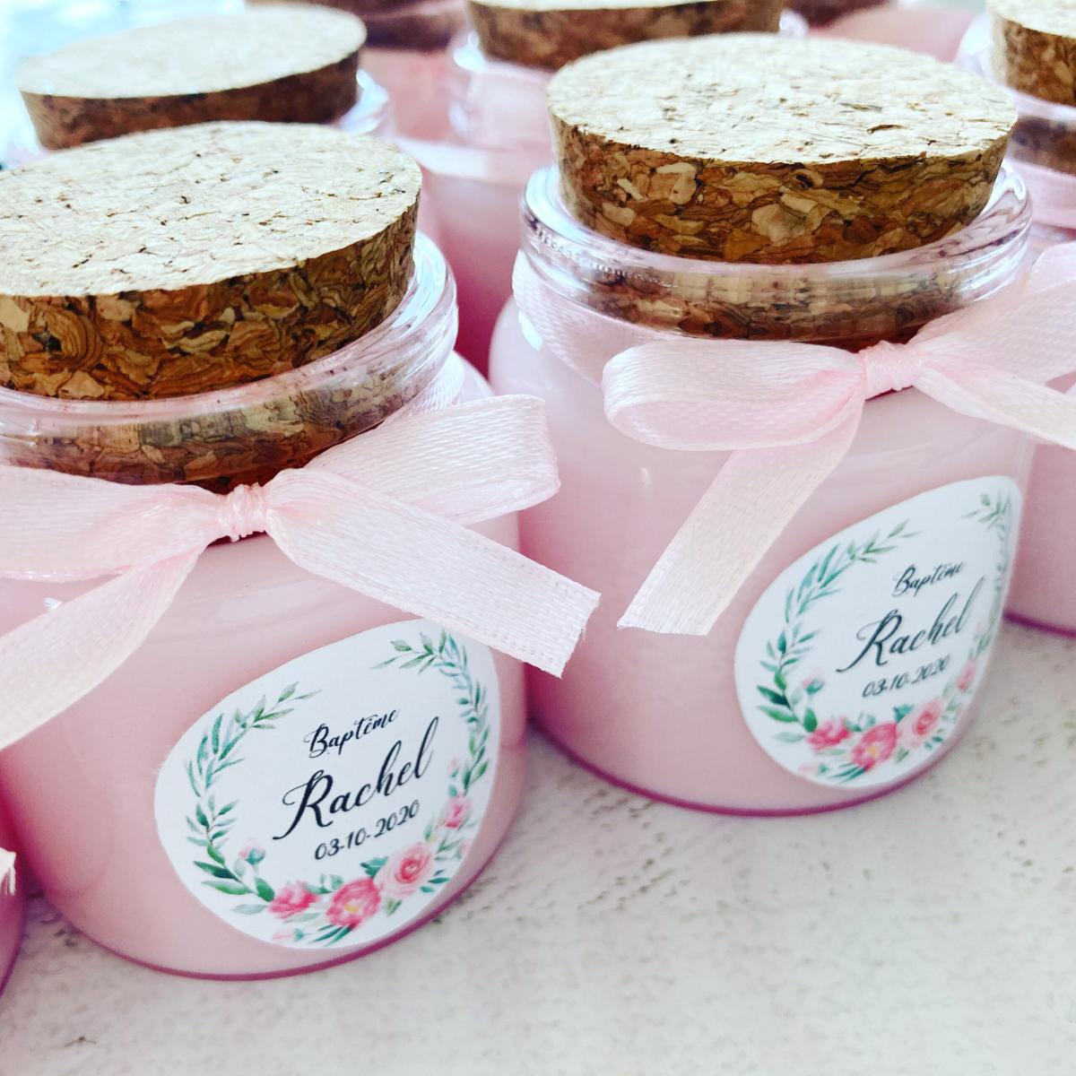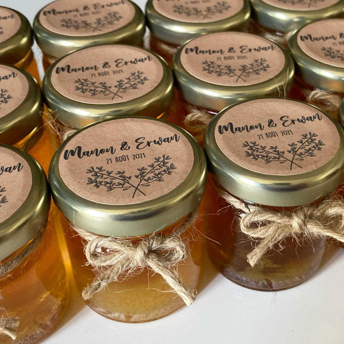 Quelques-unes de nos réalisations: bougies et pots de miel personnalisés.