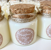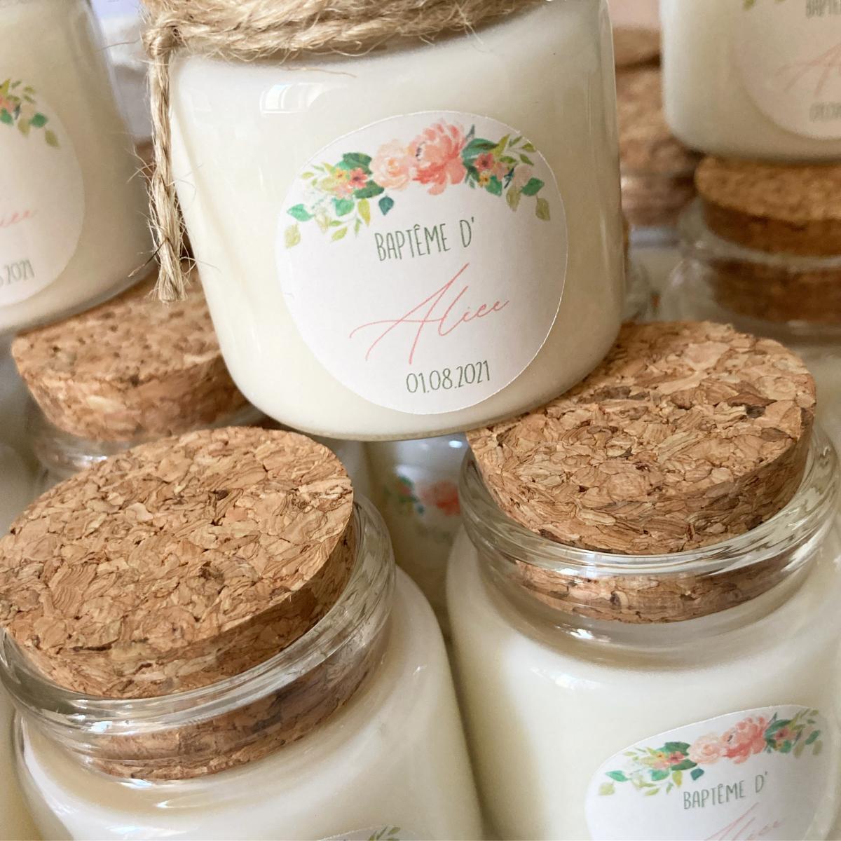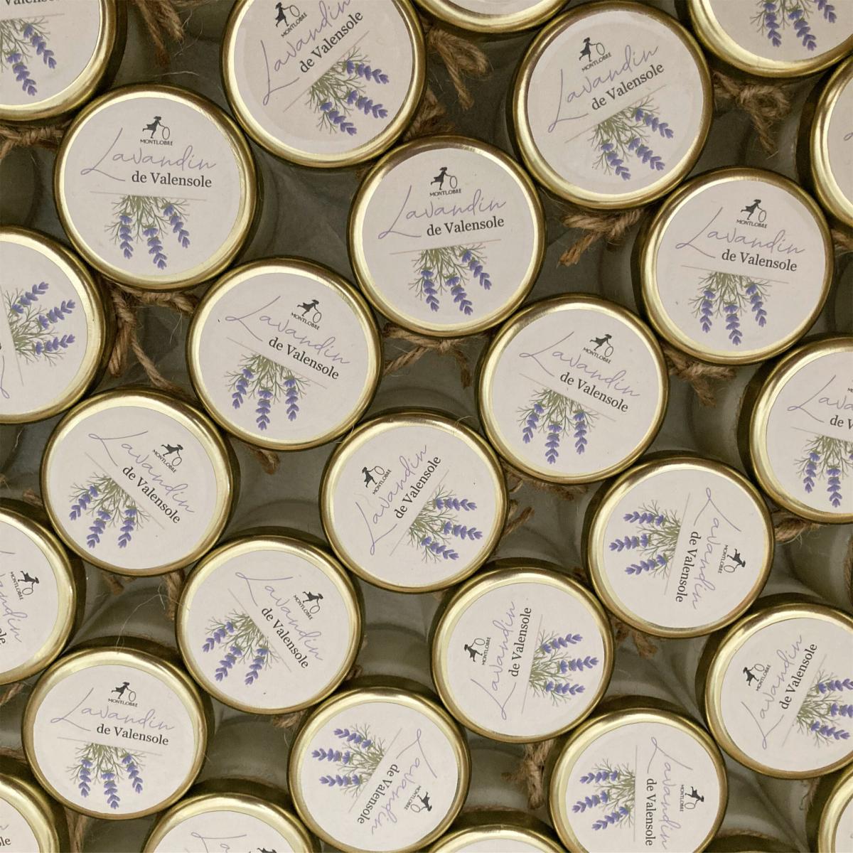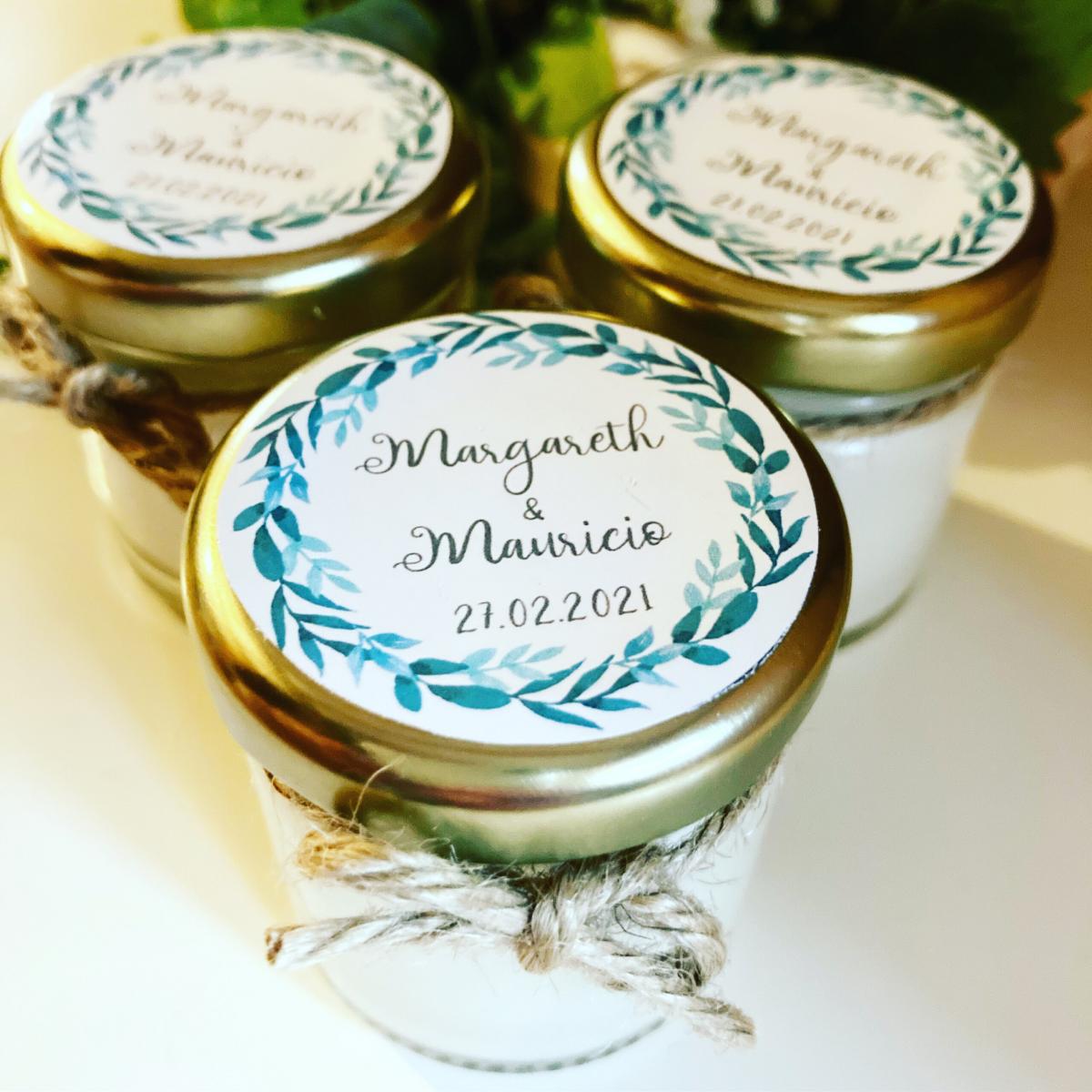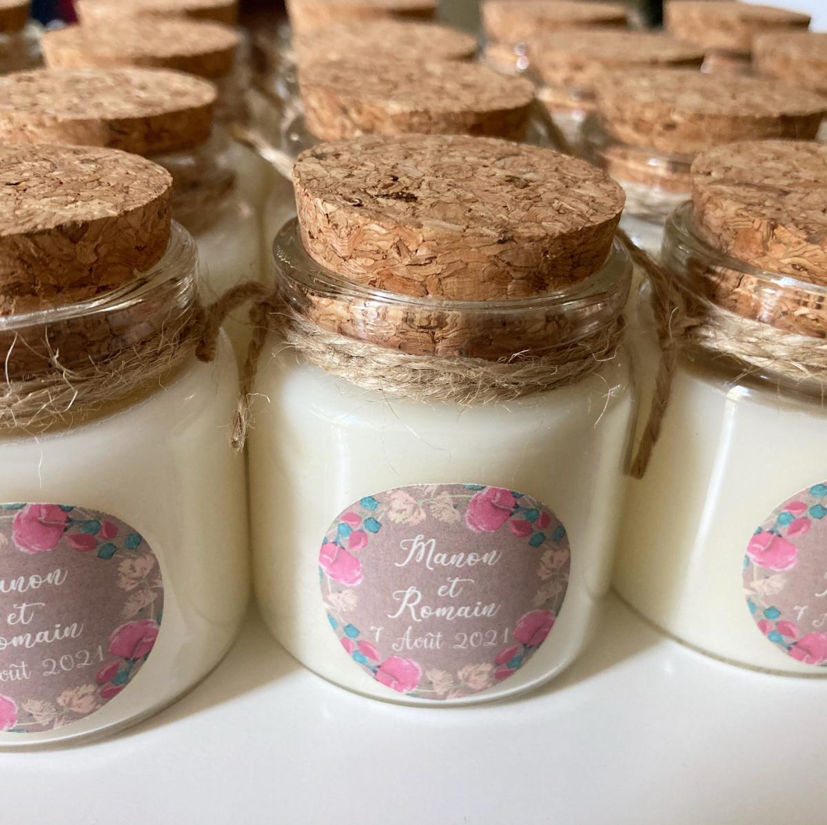 Quelques-unes de nos réalisations: bougies et pots de miel personnalisés.