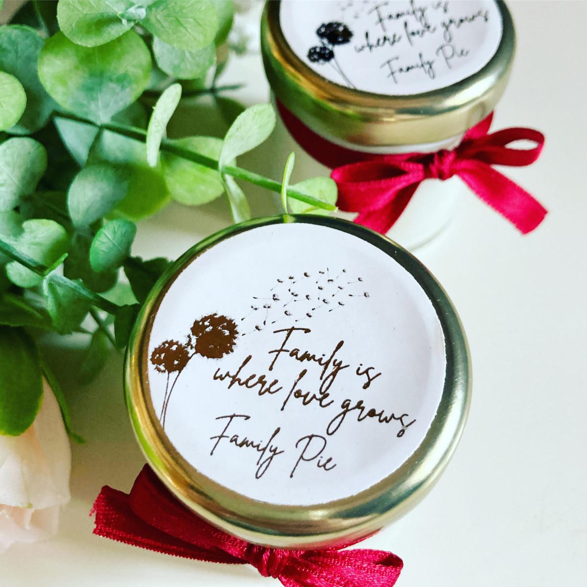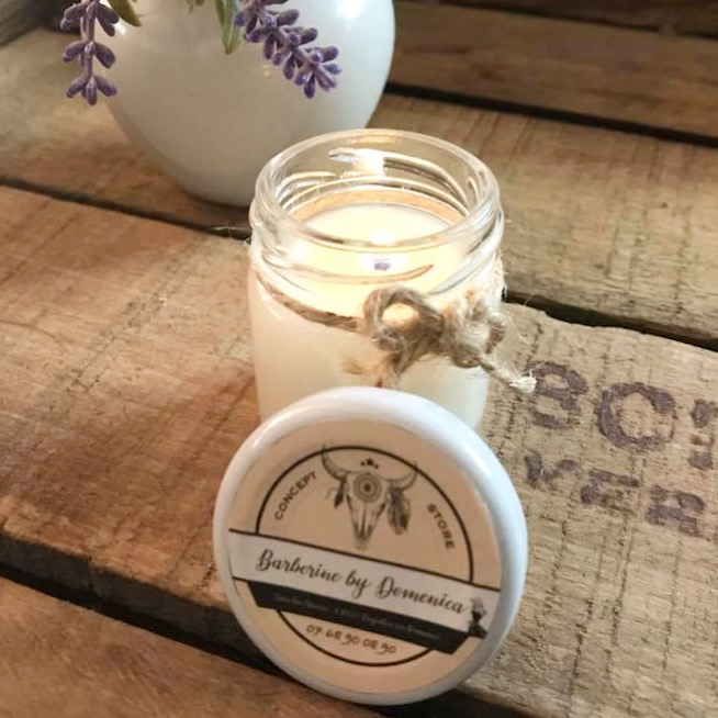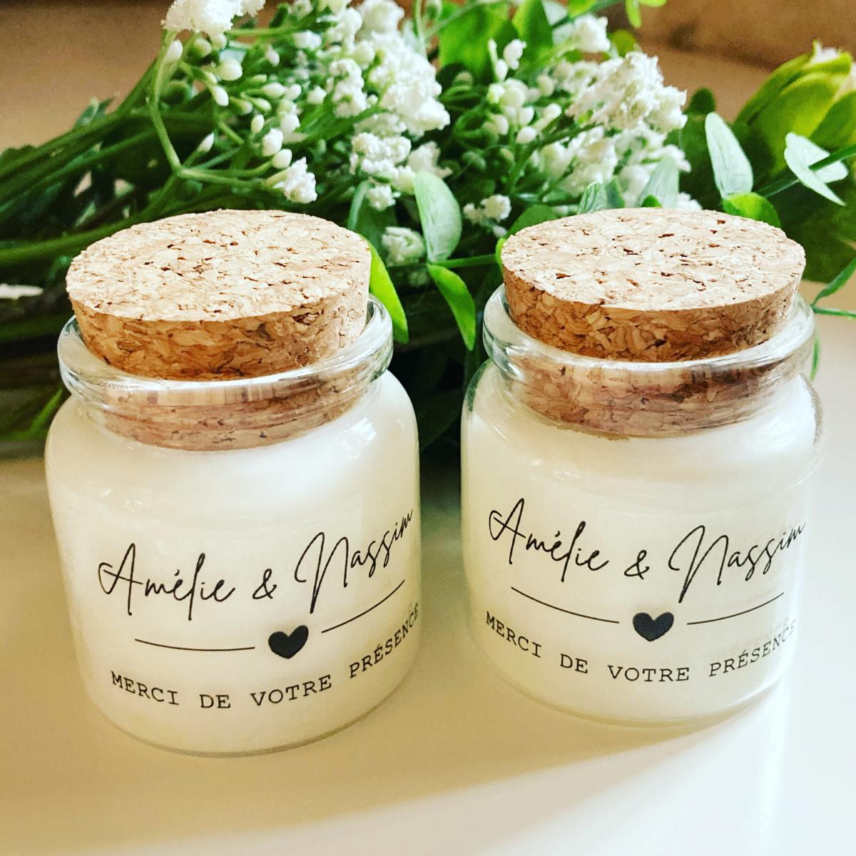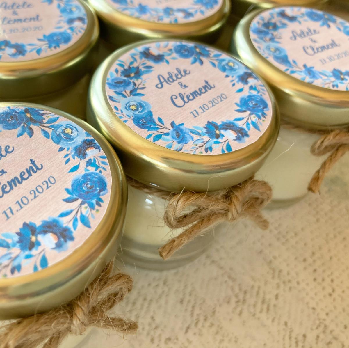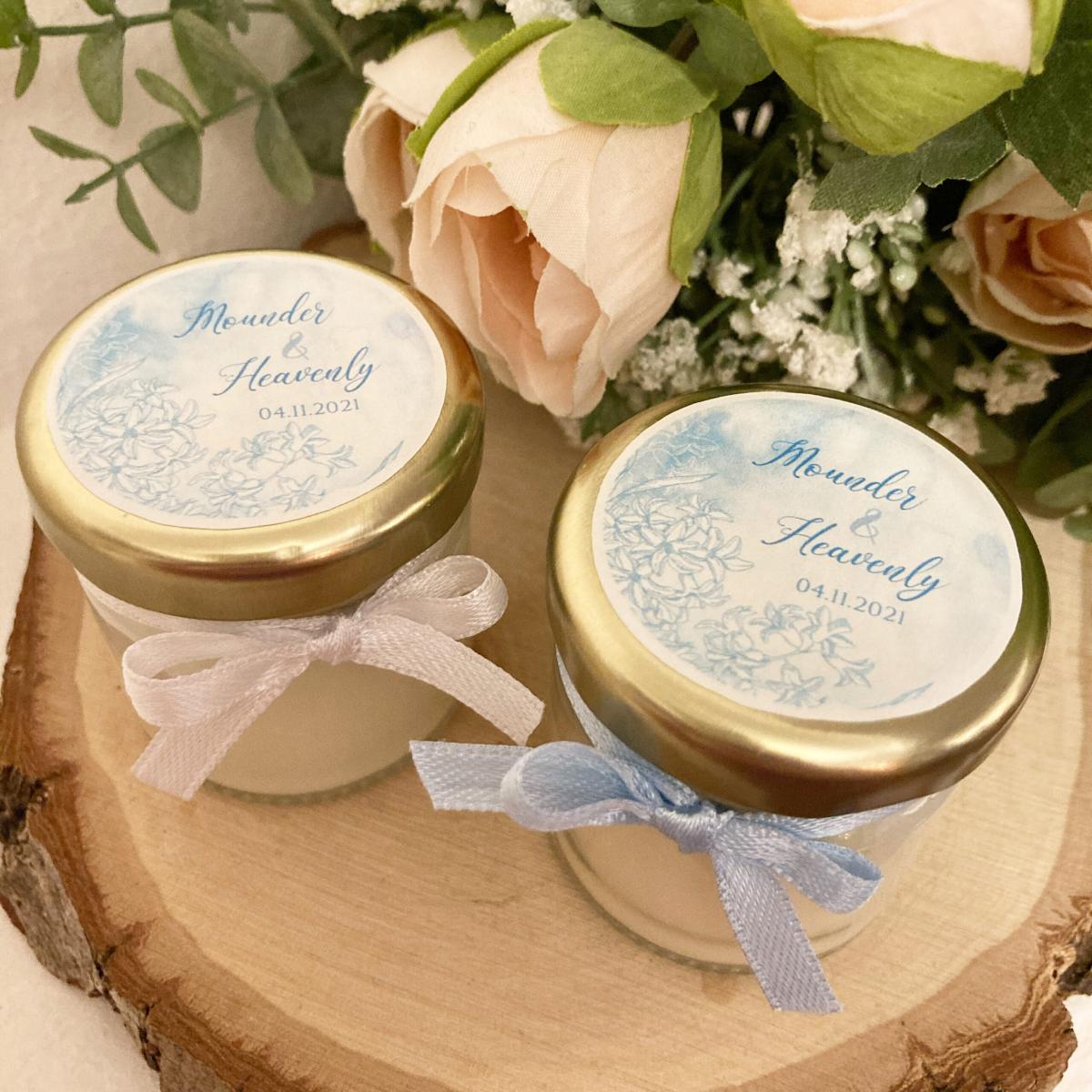 Quelques-unes de nos réalisations: bougies et pots de miel personnalisés.